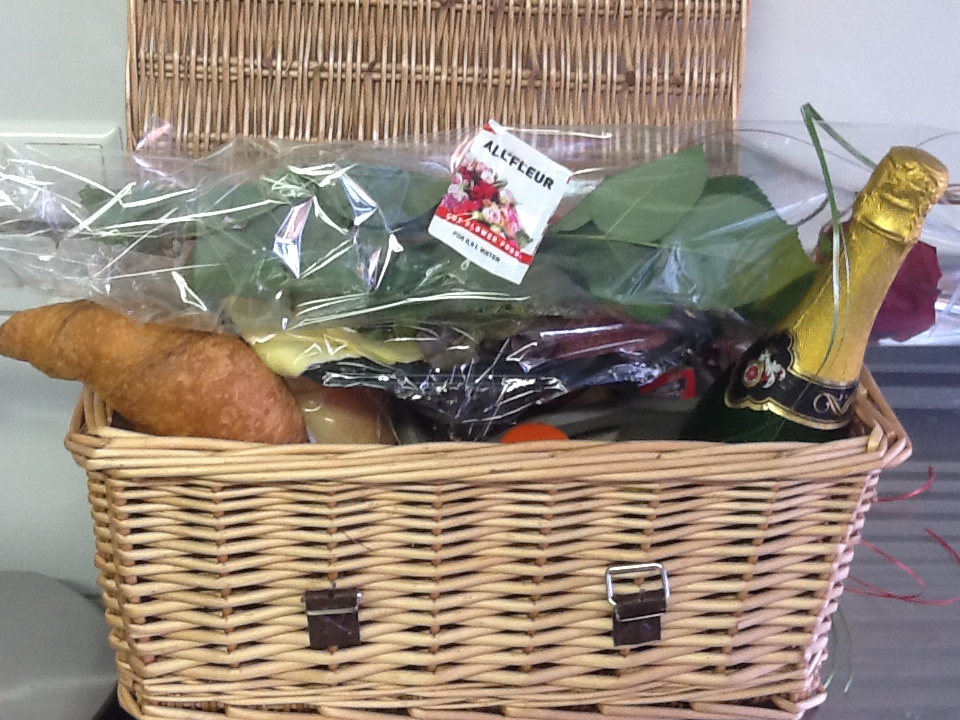 Rijk gevulde mand of dienblad met heerlijk vers afgebakken broodjes, div vleeswaren , zoetwaren